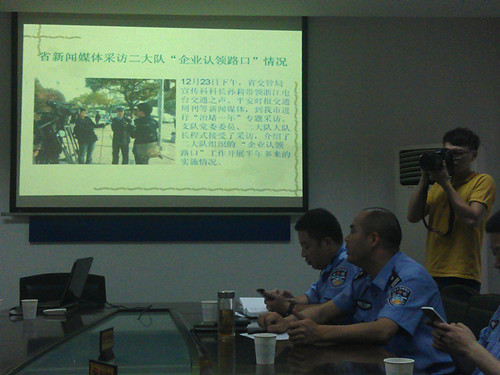2014年5月29日下午,汽机学院绿色啄木鸟志愿队的两名志愿者代表与李艳老师一同前往温州市交警二大队,参加“拒绝中国式过马路”交通劝导活动一周年总结大会,参加本次会议的还有其他8家合作单位。