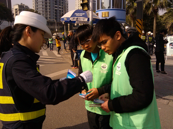 3月5日是雷锋纪念日,为了弘扬雷锋精神,深化雷锋活动,汽机学院“啄木鸟”志愿者来到温州时代广场,协助交警支队二大队进行文明交通法规的宣传,开展志愿服务活动。