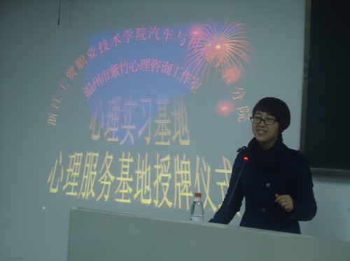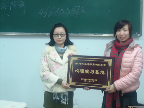 2011年12月15日晚7点,汽机学院与温州紫竹心理咨询工作室“心理服务基地”“心理实习基地”的授牌仪式在6708教室举行。参加本次仪式的有来自紫竹心理咨询工作室的咨询师郑雯丹老师和周奇肖老师,汽机学院辅导员李艳老师,以及11级的心理委员、班长和团支书。