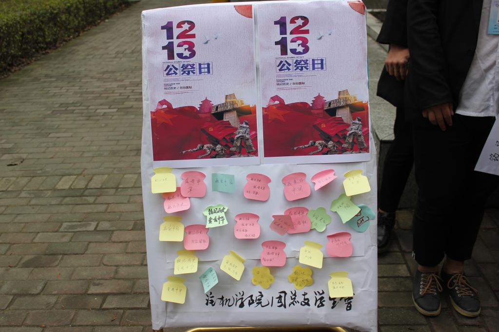 南京大屠杀是中国人不可忘记的历史,30万鲜活生命在惨绝人寰的杀戮中逝去。作为当代大学生,我们应当铭记这段让可爱生命消逝,民族尊严失去的岁月。在我们的倡议活动中,工贸学子们积极参与活动,在白色方纸上,在便签纸上写下他们心中的话。