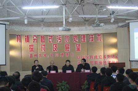 活动第二项议程是开展以《村镇分散式污水处理技术探讨及展望》为题的专业讲座,由郑向勇博士主讲,吴学亮书记主持。学院领导汪焰副院长出席讲座开幕式并致辞。汪焰副院长以最近在网络热传的一首描述雾霾的诗歌风趣开场,又不无焦虑地跟在座的师生们讲述了环保产业亟待发展的现状。节能环保产业作为绿色经济的引擎,是国家重点扶植发展的战略性新兴和主导产业,有着巨大的市场潜力和广阔的发展前景,其专业人才的需求量是极大,因此,汪院长勉励同学们积极投身环保专业的学习,也对在座的教研室老师们提出了人才培养的要求。郑博士在讲座中分享自己多年在污水处理方面积累的经验,跟在座的师生们讲述了村镇分散式污水处理技术目前的是如何开展的,应用技术方面又有哪些能够进一步地进行产业升级。郑博士的讲座立足现实展望未来,前沿的污水处理技术也给同学们开拓了视野,给老师们有所启示。