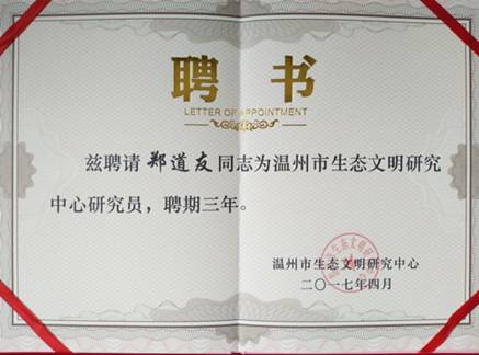 我院郑道友副教授入选专家库,被聘为温州市生态文明研究中心研究员