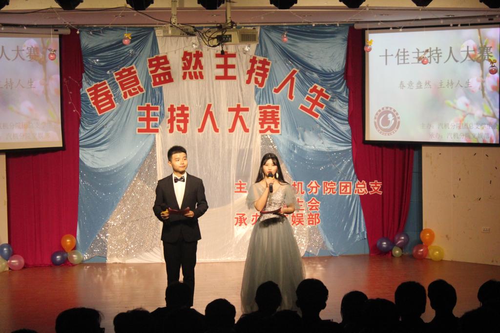 为丰富校园文化生活,营造良好的文化氛围,展现分院学子的青春风采,拓展学生的综合素质能力,2019年4月1日晚上,汽机分院在阶梯教室举行以“春意盎然,主持人生”为主题的十佳主持人大赛。分院辅导员周全、黄丹华、公寓辅导员衣慧子、分院上届主持人亚军崔浩强作为比赛裁判参加此次比赛。