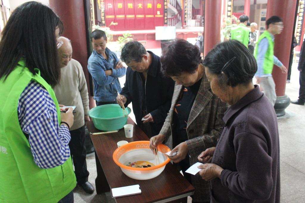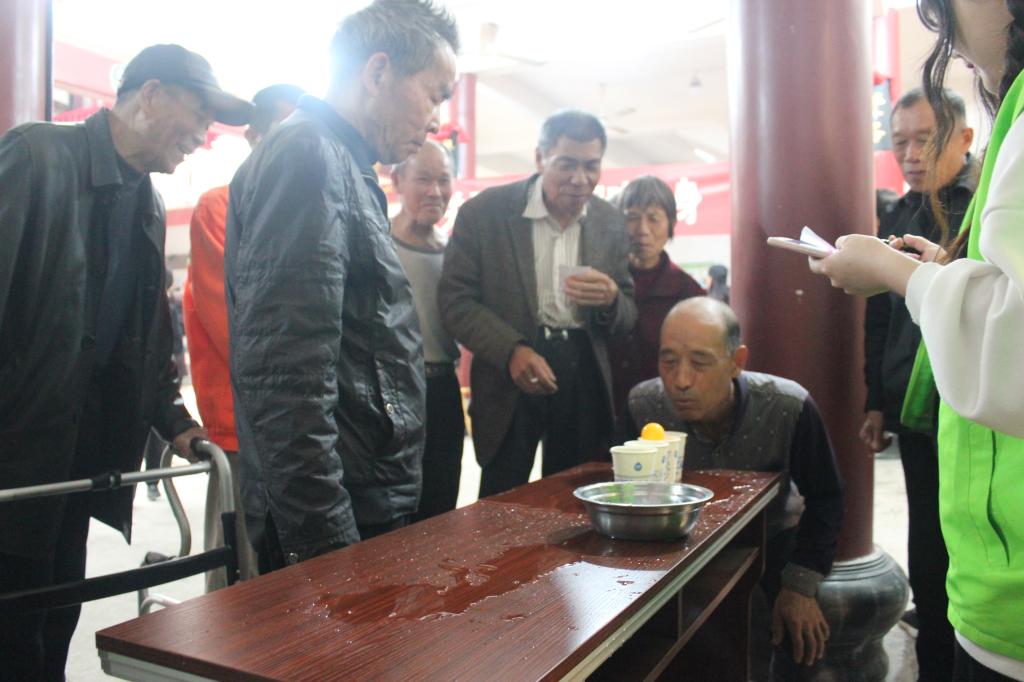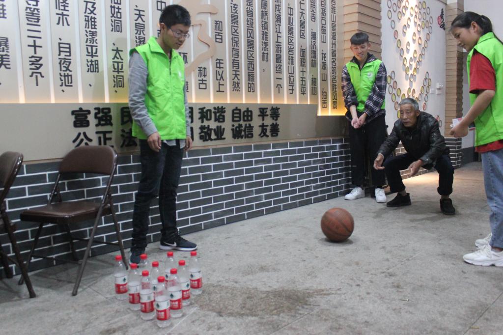 上午7点30分,志愿者坐上校车来到雅漾村文化礼堂。到达活动现场后,与文化礼堂负责人对接后,志愿者们积极准备活动物资,贴横幅、搬桌子、摆道具,问候老爷爷老奶奶。上午9点整,在志愿者钟锦威同学的开幕词下,活动正式拉开序幕。为了方便与当地村民交流,提升亲切感和踏实感,钟同学特意使用温州方言主持。钟同学提到,在活动开始前,由志愿者郭紫薇与陈佳佳教导各位爷爷奶奶做健身操,帮助大家活动筋骨。在两位女生的带领下,各位老人们开眉展眼并积极配合完成热身操。接着,志愿者们向老人们发放积分卡,凭借积分卡完成趣味小游戏,并根据积分获得相应礼物。