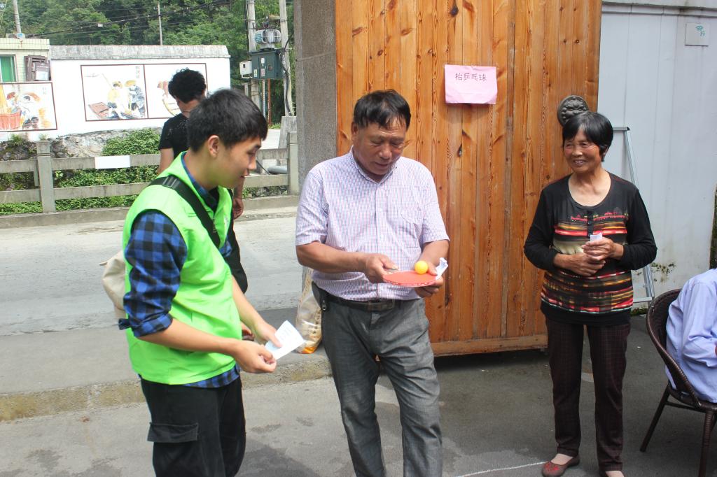 上午7点40分,志愿者队伍坐上校车来到小岙村文化礼堂。经过1个小时的车程,队伍到达活动现场,与文化礼堂负责人对接后,志愿者们认真准备活动,贴横幅、搬桌子、摆道具做得井井有条。上午9点30分,活动正式拉开序幕。首先由志愿者林云敏同学带队热身,帮助爷爷奶奶们活动筋骨,以免受伤。为了方便与当地村民交流,提升亲切感和踏实感,林云敏同学特意使用温州方言教导各位爷爷奶奶热身。在两位志愿者的带领下,各位老人们积极配合。热身结束后,志愿者们向老人们发放积分卡,凭借积分卡完成趣味小游戏后获得积分,并根据积分兑换相应的奖品。