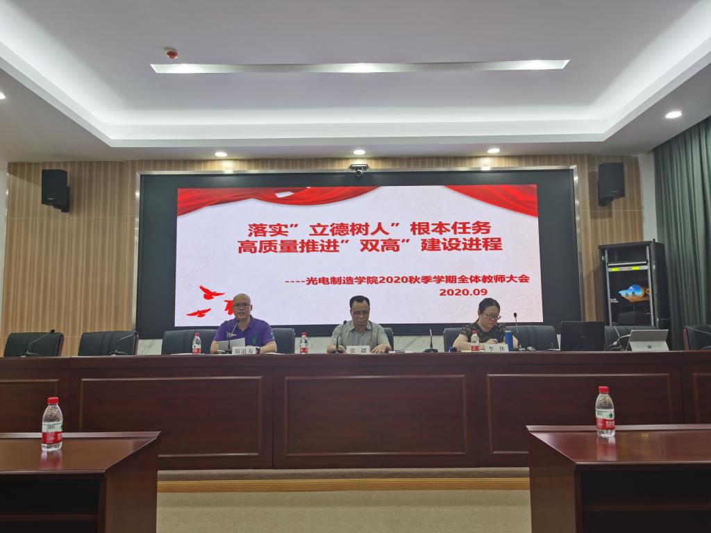 9月7日下午,光电制造学院2020年秋季学期全体教师大会在瓯江口校区行政楼104会场召开,本次会议的主题是"落实'立德树人'根本任务,高质量推进'双高'建设进程”。党总支书记张勰、分院院长郑道友和党总支副书记李侠以及80余名教师参加了本次大会。