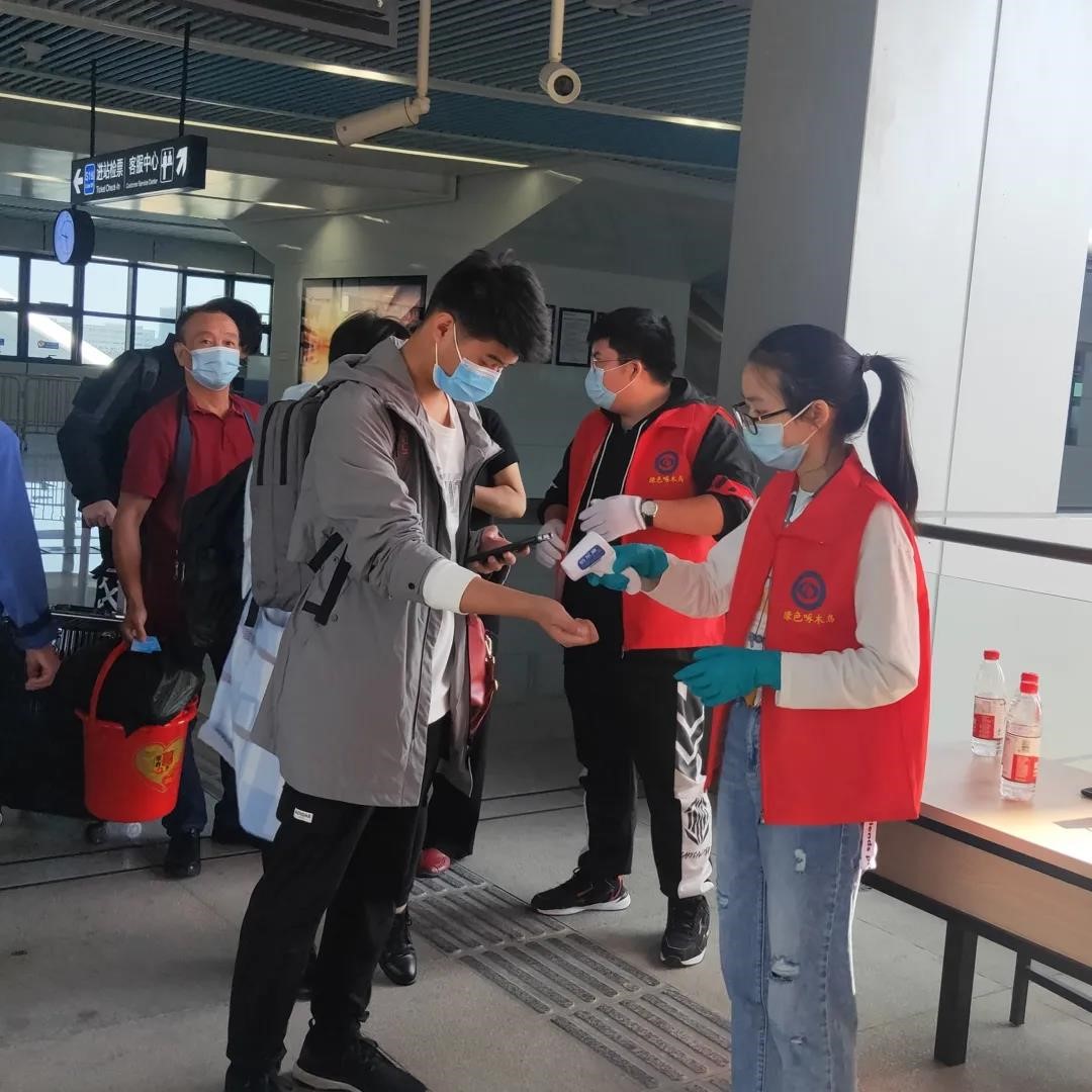 轻轨站的志愿者负责给动车转轻轨的新生们,测量体温、查看健康码并引导他们有序乘坐校车前往学校。