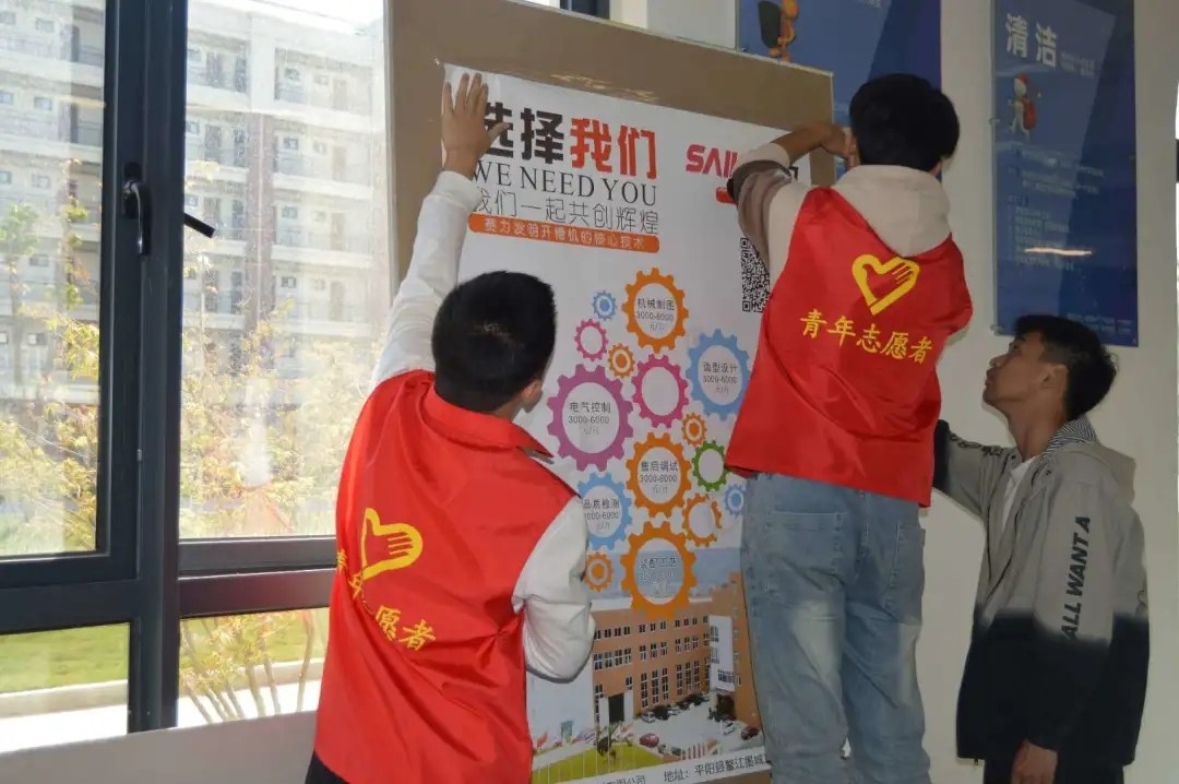 即使风再大,也吹不散志愿者们的工作热情。活动当天,从新校区东大门到会场的路上,每个转角都设置两名志愿者引导企业人员进入场地,在会场的志愿者们则是帮助各企业单位布置他们的场地并粘贴企业海报,且在第一时间满足企业需求。