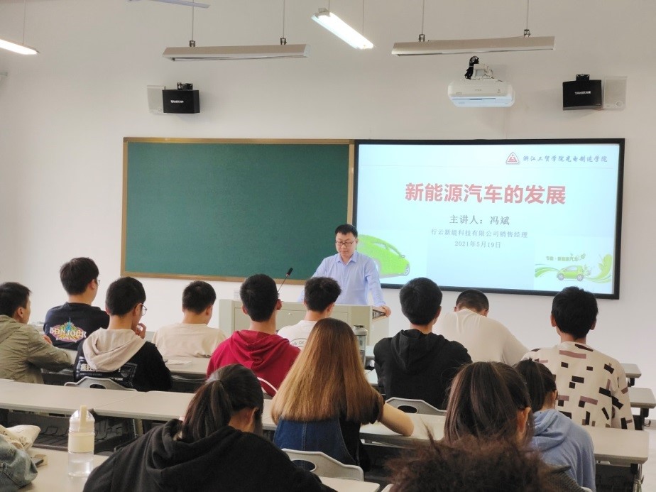 2021年5月20日上午,行云新能科技(深圳)有限公司销售经理冯斌应邀来我院为汽车专业的学生作题为《新能源汽车的发展》的专题讲座,参加此次讲座的主要是20级汽修班和汽销班的学生。