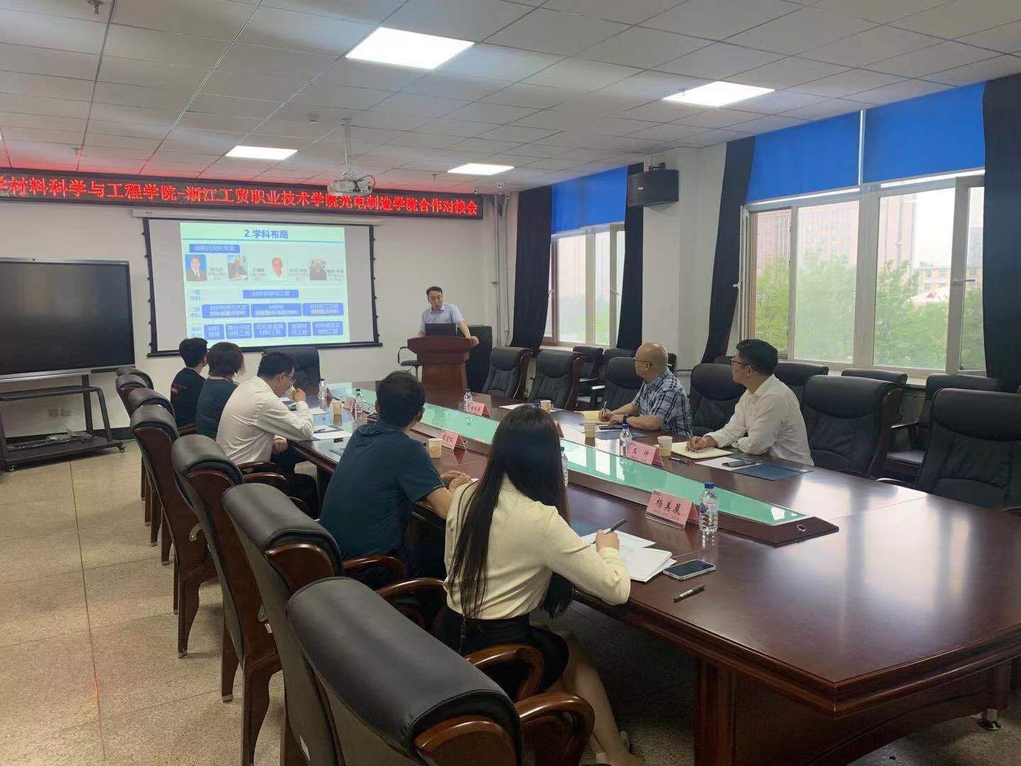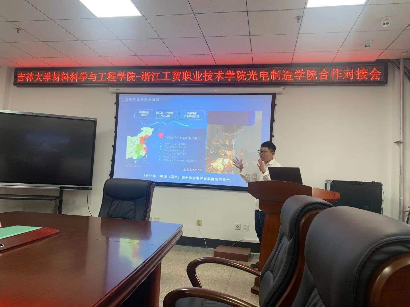 交流会上,副院长王文权首先介绍了吉林大学材料学院与浙江工贸职业技术学院合作的研究生培养基地、龙湾区激光加工技术应用中心、温州市/浙江省协同创新中心等平台以及国家光机电应用技术教学资源库、温州市重大科技创新攻关项目等各类项目的合作成效。然后讲解了吉林大学材料学院的发展历程、学科布局与“双一流”建设成效等。
