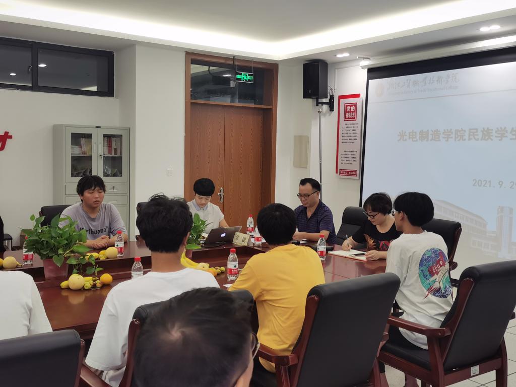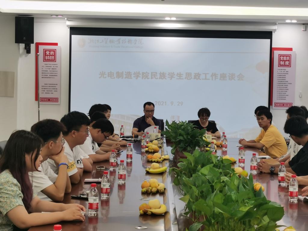 张勰书记听取了与会学生的交流发言后他说,自2013以来习近平总书记多次到民族地区调研,总书记反复强调“促进各民族像石榴籽一样紧紧抱在一起”。工贸学院历来重视少数民族学生工作,促进民族团结、引领学生成长成才一直是学院工作的一项重要内容。张书记分享了自己担任工贸学院第一届新疆班班主任的经历和感想,也谈到光电分院眼下正有25位西藏职业技术学院师生在校为准备2021年全国职业院校技能大赛教学能力大赛而努力,分院组织了教师节及中秋节慰问、还组织这些学生到南塘观光自然风景,努力促进各民族学生交往交流交融。最后,张勰书记对分院少数民族学生提出了三点希望:一、好好学习,知识能够改变命运。要正视各地教学差异,克服学习上的困难。要明确学习目标,实现专科、本科、研究生的升学梦想。二、和谐相处,亲如一家。要相互尊重民族习惯,愉快健康地生活,在校园里营造亲如一家人的氛围。三、民族特色要体现。要发挥各民族文化优势和特长,展现个人才艺,投身到各类比赛中去。也祝愿大家学习进步、生活愉快、身体健康。