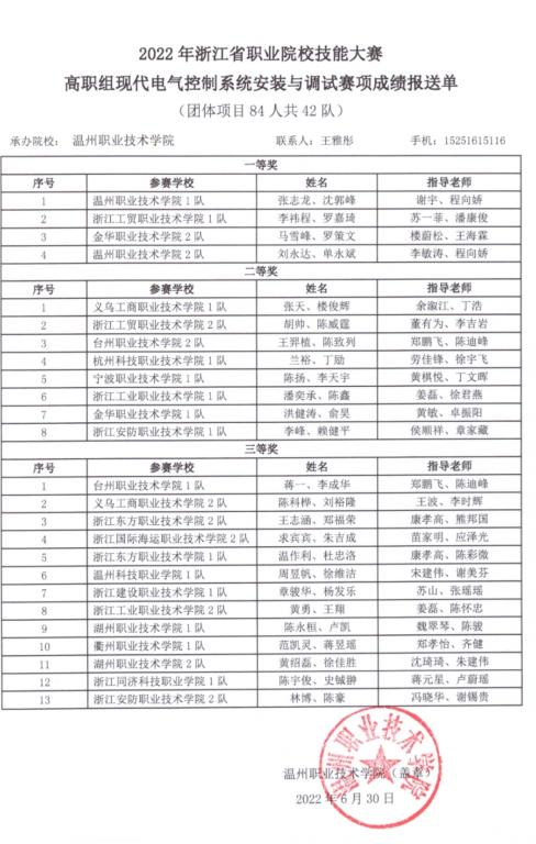 本次大赛设一等奖4名,二等奖8名,三等奖11名,浙江省共有22所职业院校42支队伍参加比赛,光电制造学院工业机器人专业的2支参赛队在团体赛中表现优异,成功斩获本次大赛第2名和第6名,分别获得团体一等奖和二等奖,连续两年荣获浙江省高职院校技能大赛“现代电气控制系统安装与调试”赛项一等奖!