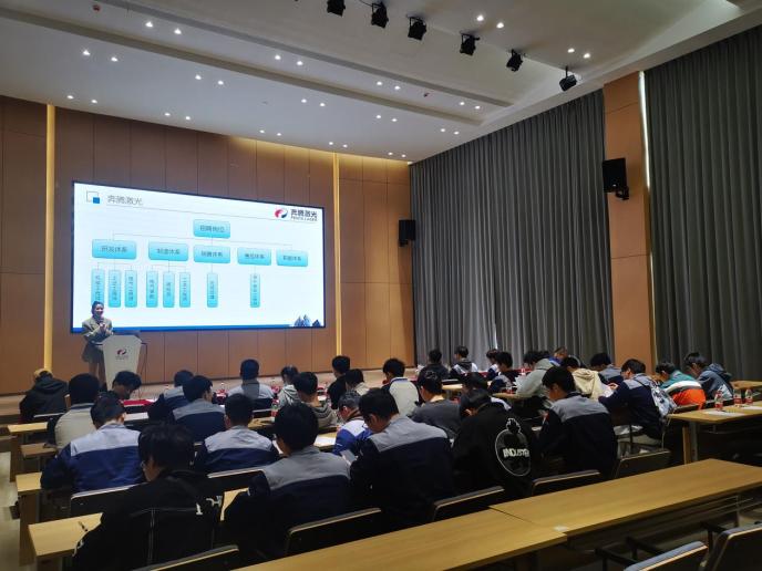 奔腾激光唐爱敏主任、人事部周赛娟部长、张耀清、王肖儒等热情迎接师生的到来。唐爱敏主任带学生参观介绍了企业展厅、远程运维中心、研发车间、生产车间、食堂、宿舍及活动娱乐场所,现场展示了最新的磁悬浮床身高速激光切割技术。周部长在报告厅给学生介绍了岗位工作内容、岗位晋升路径、公司福利待遇等。