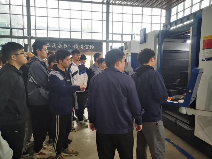 奔腾激光参观结束后,来到嘉泰激光,嘉泰激光人事部张倩经理、售后部陈庆喜主管、徐敏绎副主管等接待了师生。企业给学生现场展示了激光切管、高功率激光切割厚板等。