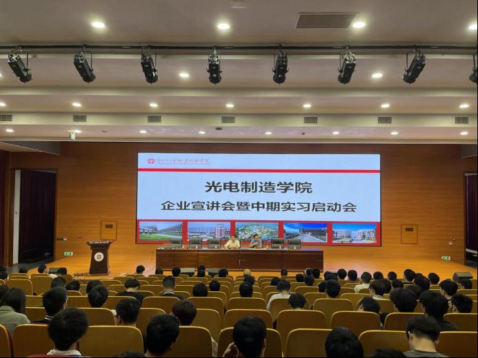 5月17日,2023年智能光电专业企业宣讲会暨中期实习启动会在我校敬听楼学术报告厅顺利举行,本次活动由钟正根老师主持,华学兵副院长参加了本次活动。本次宣讲会邀请了省内知名的十家光电类企业参加活动,2021级智能光电制造技术专业、2020级机械工程(光机电应用技术)四年制本科专业近200名学生参加了本次活动,