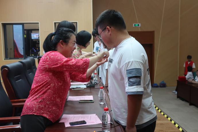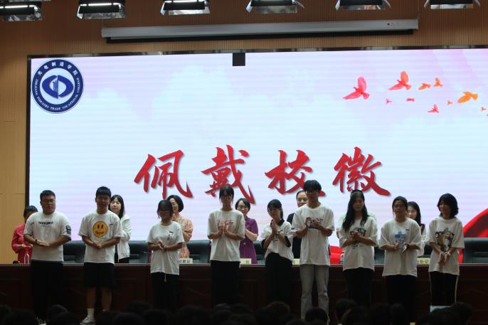 大会在嘹亮的国歌声中正式拉开序幕,参会老师为新生代表佩戴校徽。