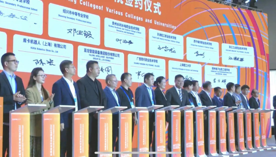 论坛上进行了工程师培训认证项目、亚龙-库卡工程师学院、产学研合作项目、“一带一路”职业教育国际化合作项目、智能制造领域中外人文交流人才培养基地项目的签约、授牌,光电制造学院工业机器人专业教师潘康俊作为代表参与了签约仪式。