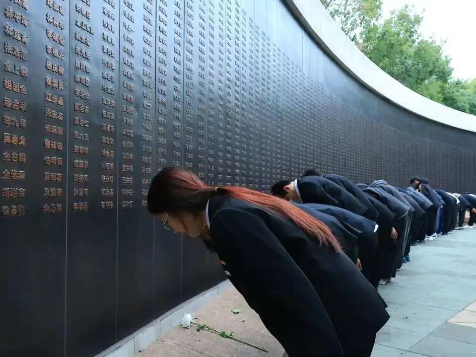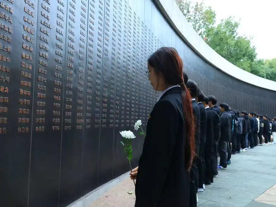 默哀仪式结束后,同学们依次环绕烈士名录墙向长眠在此的烈士敬献白菊花,每一朵花都寄托着对先烈的无限哀思与敬仰。