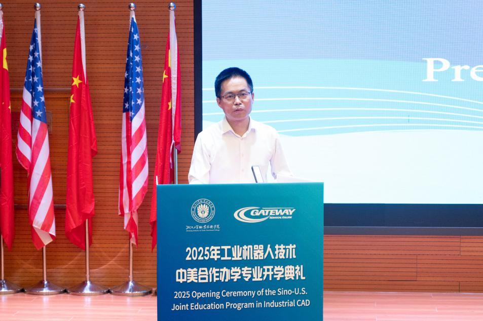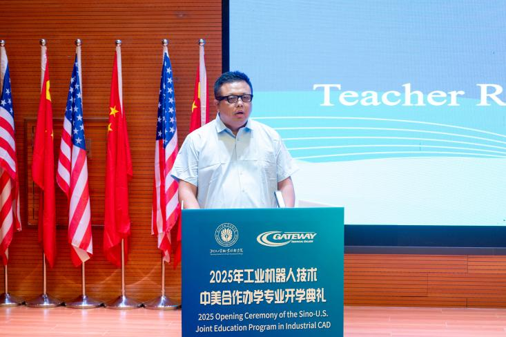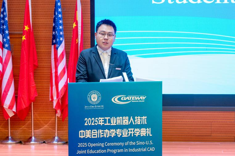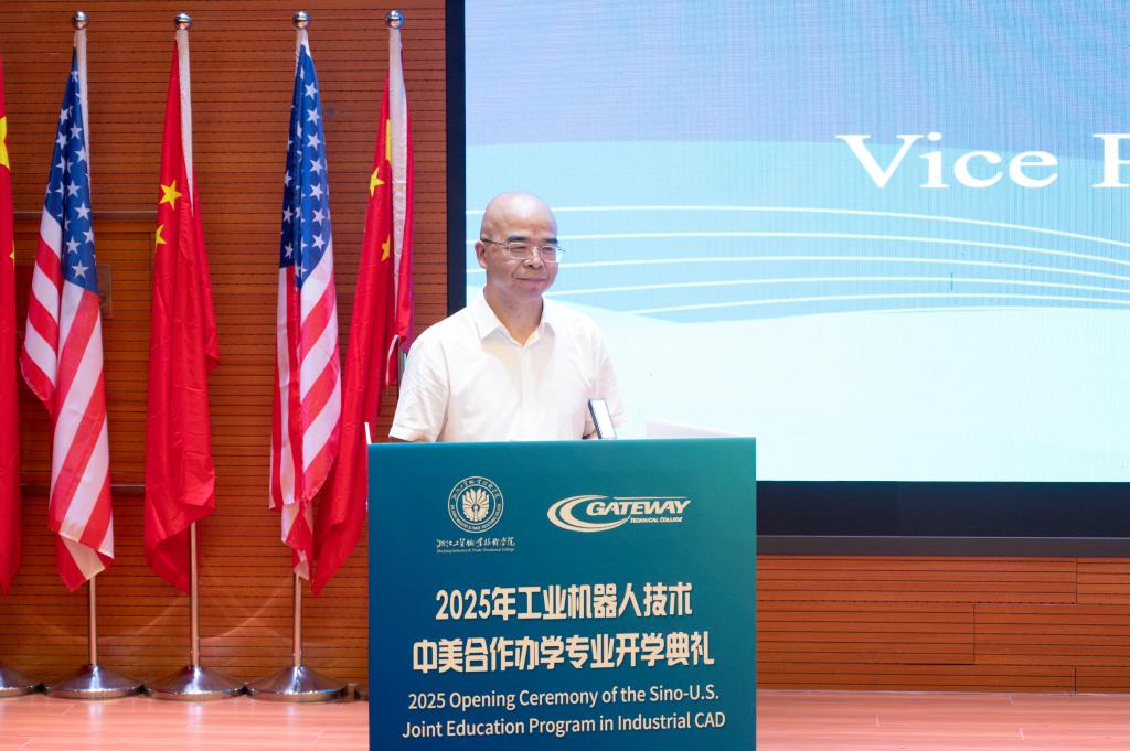 最后,浙江工贸职业技术学院副校长汪焰先生说到,本次开学典礼不仅是一场仪式,更是一堂生动的“开学第一课”。随着工业机器人技术(中美合作办学)专业的深入推进,学校将进一步联动中美教育资源,持续优化“双师型”教学团队与模块化课程,为区域经济高质量发展与制造强国战略注入新生力量。