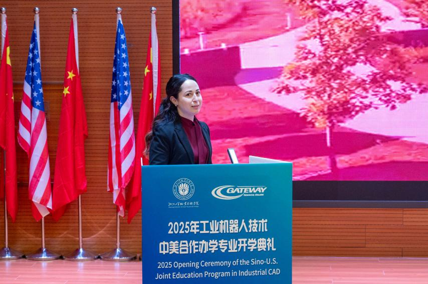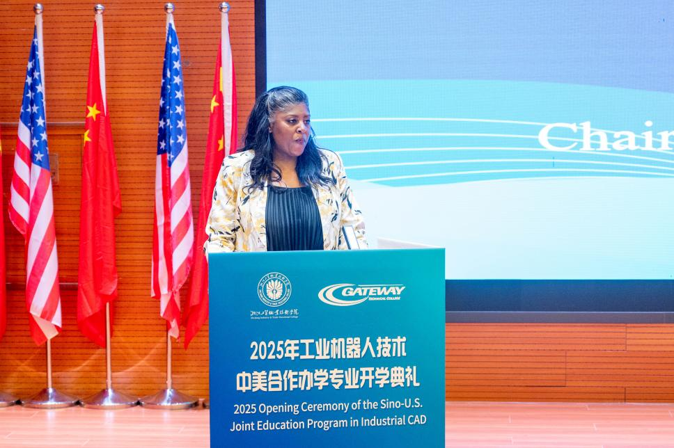 9月25日,浙江工贸职业技术学院光电制造学院为2025级工业机器人技术(中美合作办学)专业新生隆重举行了开学典礼。本次典礼以“融汇中外,智造未来”为主题,聚焦国际化技能人才培养与智能制造领域前沿发展,旨在为新生开启大学生涯奠定坚实基础。参会的主要领导和嘉宾有:美国盖特威技术学院副校长Demeetrise Trishele Ford,学生处主任Olivia Navarro Muro ;北卡教育联盟秘书长Shijun Espinoza,教师代表Katrelle Joyce Taylor;浙江工贸职业技术学院校长余闯,副校长汪焰,教务处处长贾永枢,国际合作与交流处处长夏侯珺,光电制造学院院长郑道友,光电制造学院党总支书记李晓星等。工业机器人技术(中美合办专业)全体学生也悉数到场。会议由浙工贸副校长汪焰主持。