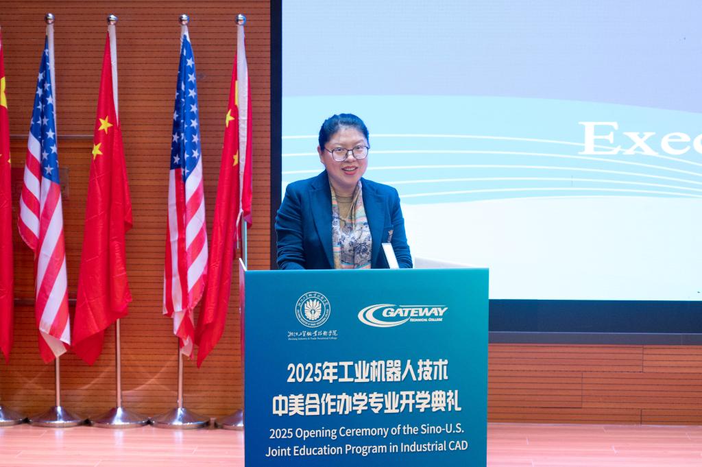 首先,浙江工贸职业技术学院校长余闯先生进行了致辞。余校长对中美合作办学项目的新同学们说:你们选择的不仅是一个专业,更是一条融合中美职教优势的成长之路。借此契机,我们期待与美国北卡教育联盟及各位教师代表一道,在三个方面深化合作:一是共建“中美职教课程资源库”;二是打造“师生互访交流计划”;三是推动“职业技能标准互认”。