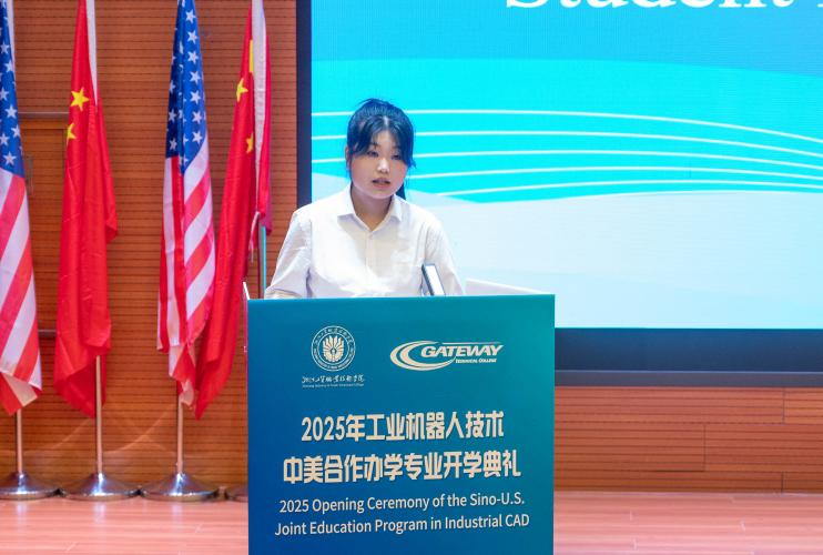浙工贸光电制造学院教师代表潘康俊、北卡联盟教师代表Katrelle Joyce Taylor和美国盖特威技术学院教师代表 Olivia Navarro Muro 分别发言。围绕“大学三问”——何为大学、为何上大学、如何上大学,寄语新生以“高尚追求、高洁品德、高深技能”为目标,将个人成长与国家智能制造发展战略紧密结合。强调,中美合作项目不仅是知识的传授,更是跨文化能力与创新思维的锤炼,希望新生“以技能报国之志,走技能成才之路”。