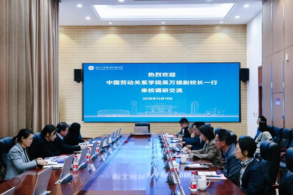 2025年12月19日,中国劳动关系学院副校长、全国工匠学院院长吴万雄、中国劳动关系学院劳模学院院长、全国工匠学院副院长高丽萍一行莅临调我校调研指导。温州市总工会党组成员、二级调研员吴客竹及相关领导陪同调研。学校党委副书记、校长余闯,党委委员、副校长杨晓珍等热情接待。校工会、产教融合处、光电制造学院、现代管理学院等相关职能部门及二级学院负责人参加调研活动。