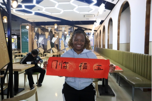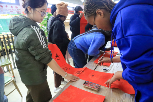 一张红纸徐徐铺开,墨香随即漫开。中国学生提笔示范,邀请南非朋友们一起诵读对联、提笔写字。横竖撇捺间,汉字的结构之美悄然显现;平仄对仗中,祝福的心意跨越山海。笔锋流转的每一划,都落成共同的盼望。红纸愈显炽热,仿佛能听见春天临近的脚步声。