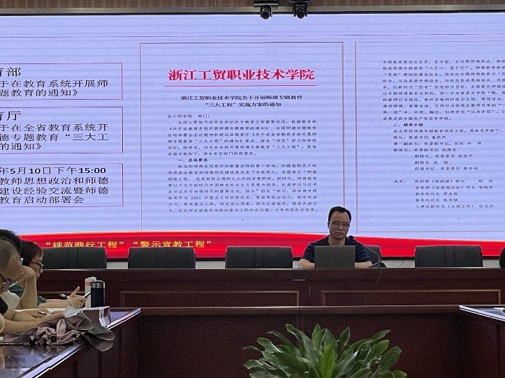 会上,张勰书记传达了教育部《关于在教育系统开展师德师专题教育活动》、教育厅《关于在全省教育系统开展师德专题教育“三大工程”的通知》和《浙江工贸职业技术学院关于开展师德专题教育“三大工程”实施方案的通知》文件精神。指出,要践行师德规范,培养创新人才,努力落实“师德示范引领工程”、“师德规范践行工程”、“师德警示宣教工程”目标任务,并和大家一起学习了《习近平总书记关于师德师风摘编》、《四史教育学习资料》、《师德学习优秀典型》、《新时代高校教师职业行为十项准则》、《高校教师违反师德警示案例》。